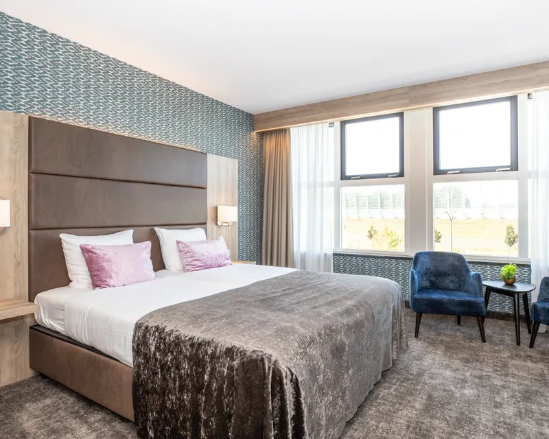 All of our comfort rooms (36m2) are equipped with 2x single box spring, measuring 2.10 meters in length, water boiler, flat screen TV and digital safe. The rooms have a luxurious finish with a desk and a chair and a separate sitting area.